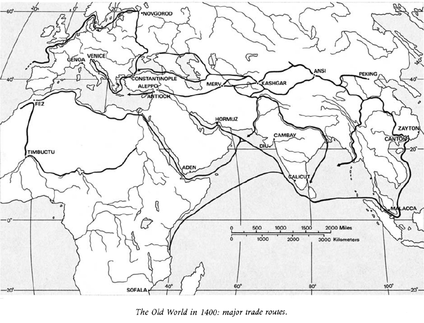 Карта основных торговых путей Старого Света в 1400 году показывает, что Индия и Китай играли центральную роль